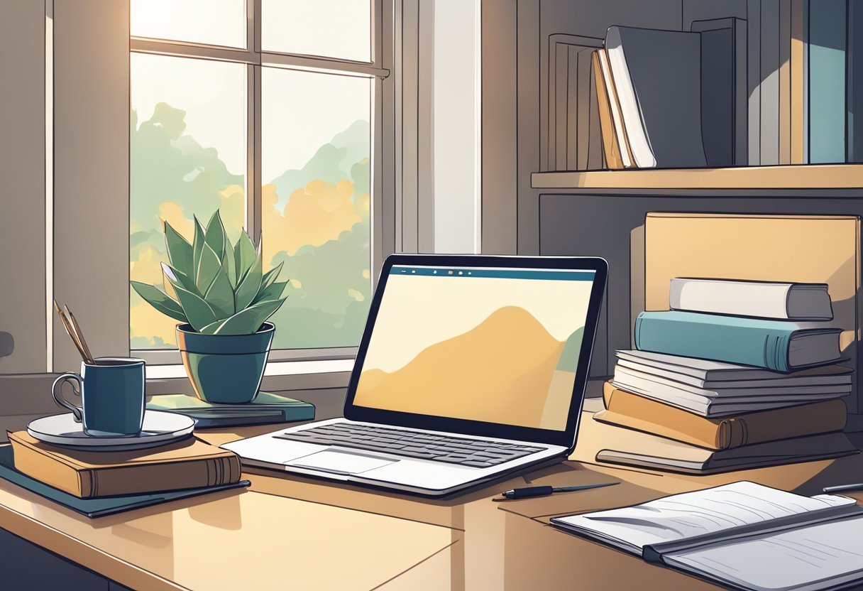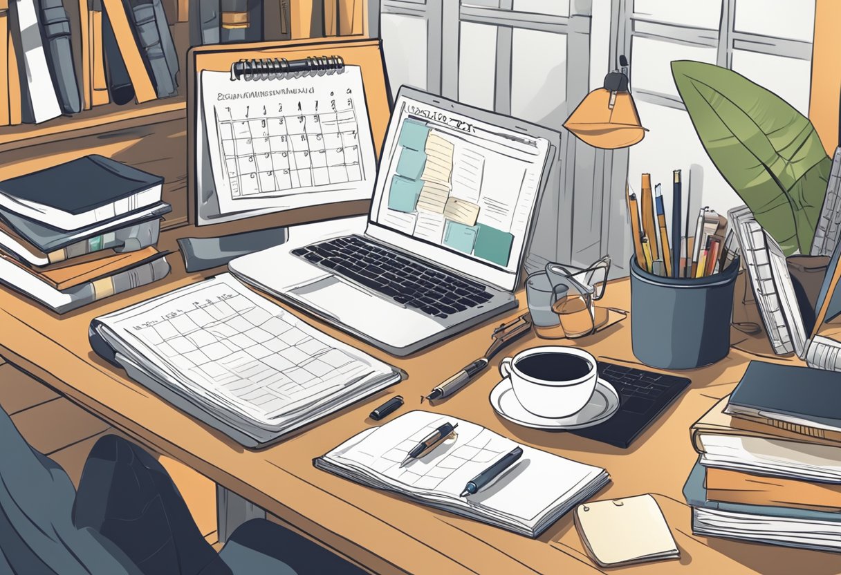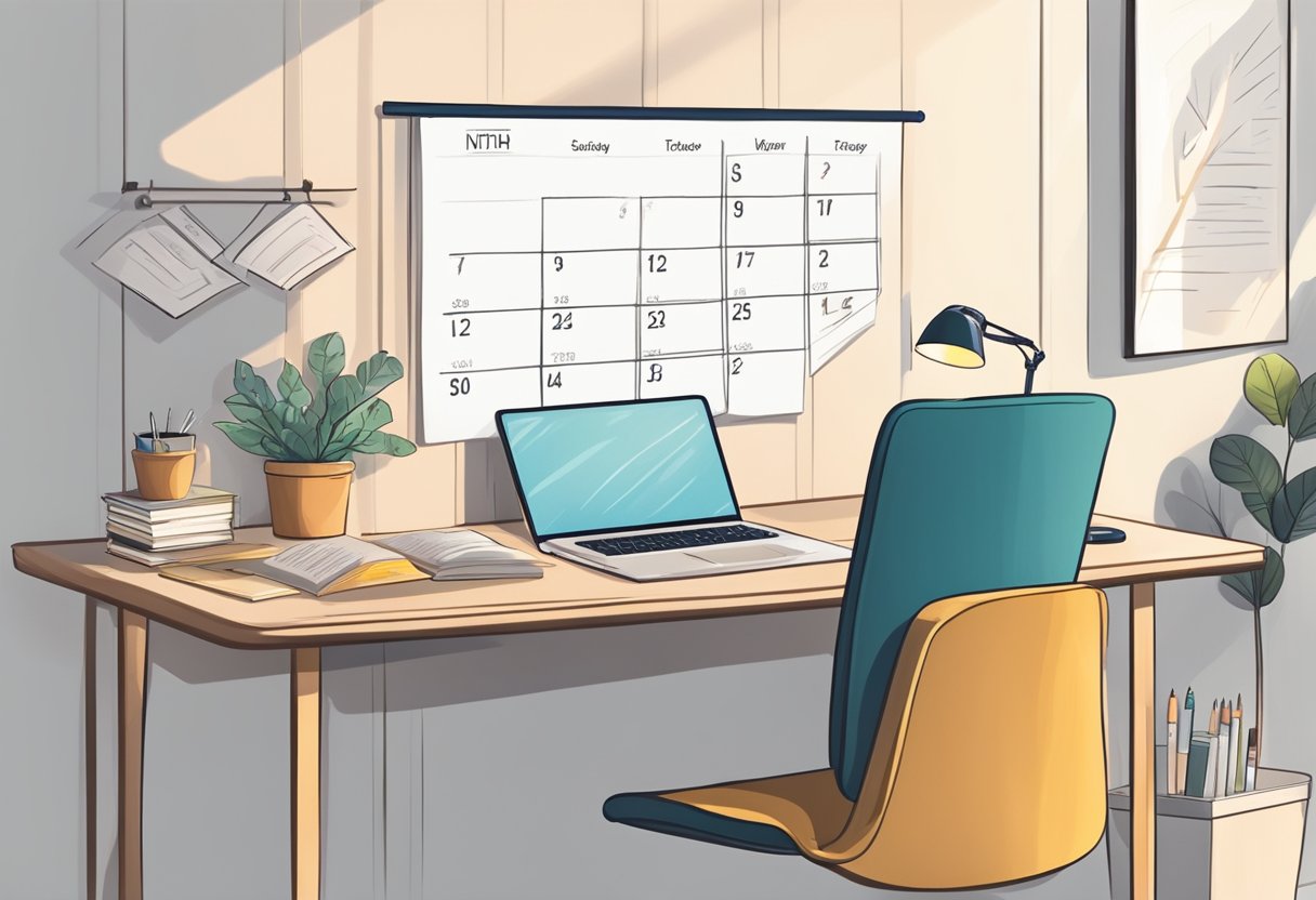 Uma mesa sem bagunça com um laptop, caderno e caneta. Um calendário com sessões de estudo marcadas. Um cantinho de estudo aconchegante com boa iluminação.