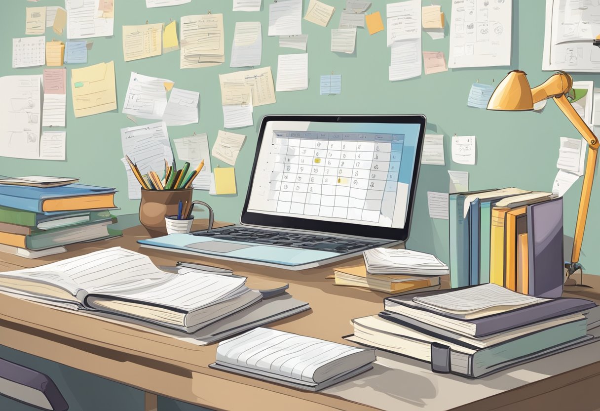 Uma mesa bagunçada com livros, um laptop e materiais de estudo. Um calendário com datas marcadas e uma lista de tarefas. Uma atmosfera focada e determinada.