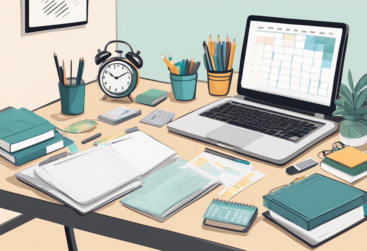 Uma mesa calma e organizada com um calendário, relógio e materiais de estudo. Um cronograma claro e tarefas priorizadas ajudam a evitar a sensação de sobrecarga.